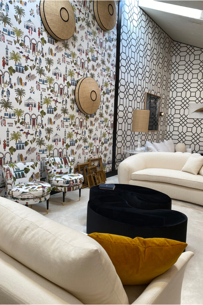 Inconfundible por el dibujo en su tejido de aire marroquí y el acabado en dorado de sus patas, la silla Bessie es una pieza cómoda gracias a su respaldo curvo que se adapta perfectamente a la forma del cuerpo.