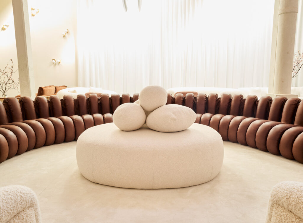 Módulo XXL realizado en forma ovalada/circular y tapizada en rizo que cuenta con cuatro almohadones almendrados.