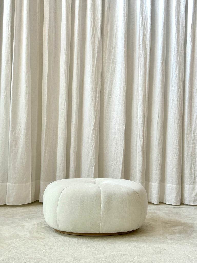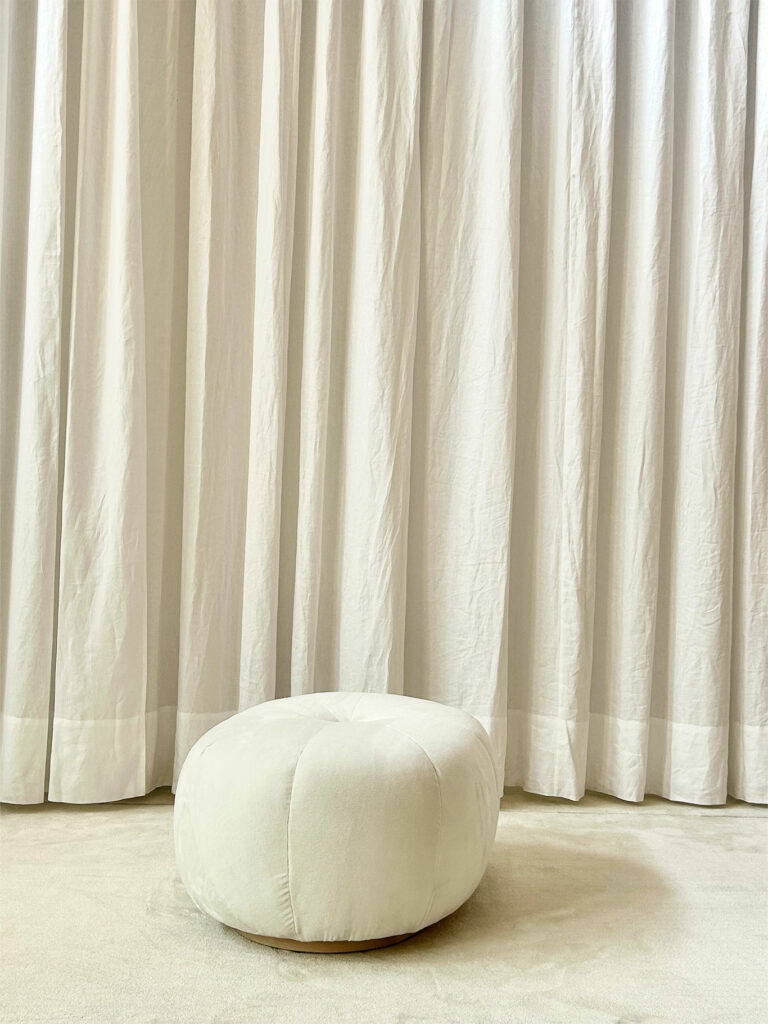 Módulo tapizado en terciopelo blanco que puede ser utilizado como asiento o como mesa baja, lo que lo convierte en una opción versátil.