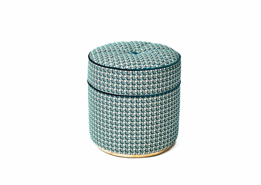 Puff tapizado con estampado geométrico y ribeteado en terciopelo azul. Esta pieza nos traslada directamente al universo de la moda y las tendencias, con un estampado que sin duda recuerda al icónico tweed de Chanel.