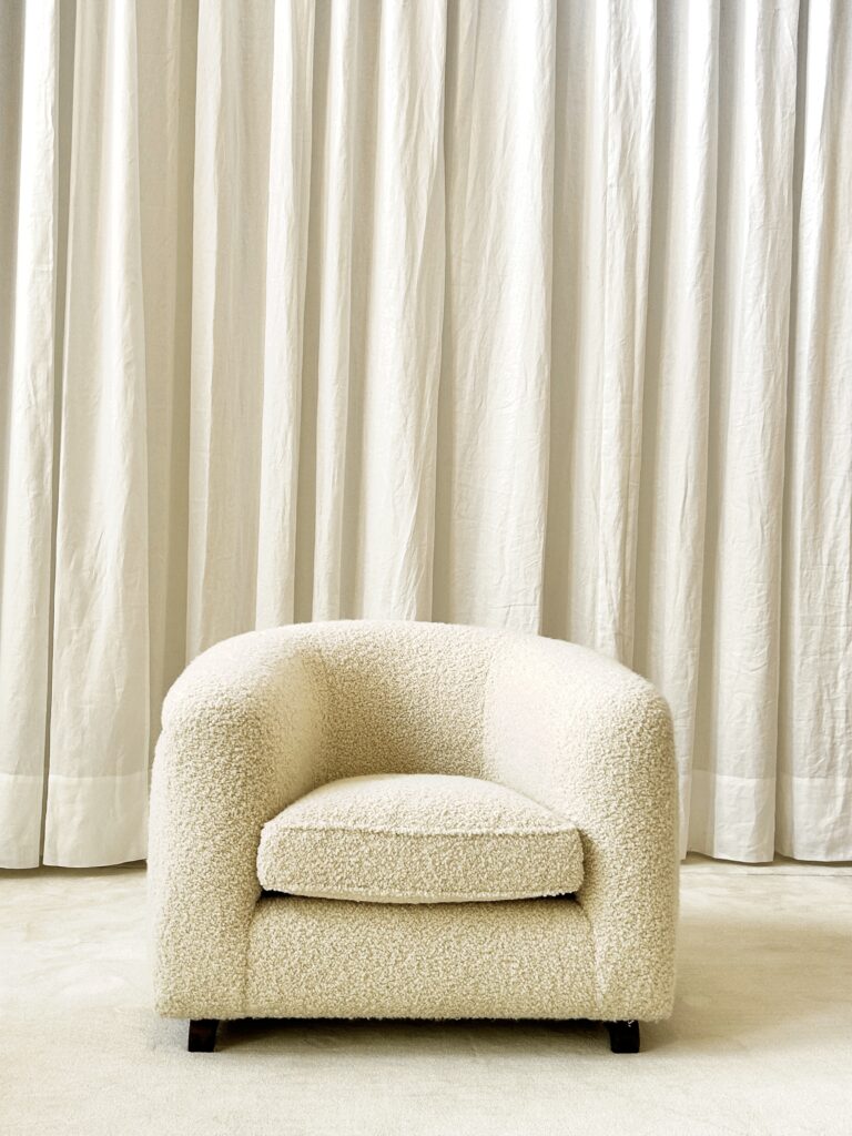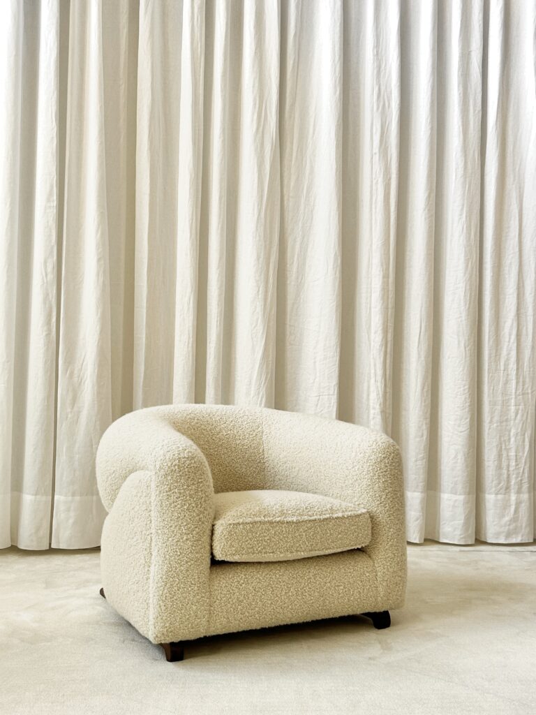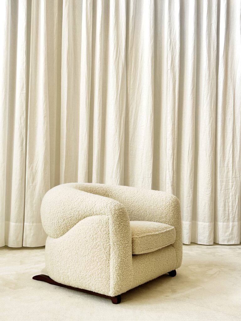 Esta butaca resalta por sus curvas, líneas sinuosas y su tapizado bucle. Una línea continua recorre los brazos y el respaldo de la butaca de extremo a extremo. Una sensación de absoluto confort cuando estás sentado en él. Aparentemente imperceptibles la butaca está soportada por unas patas de madera de diseño.