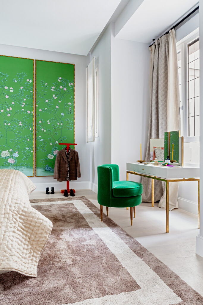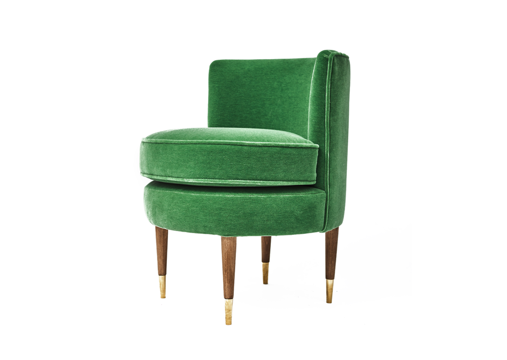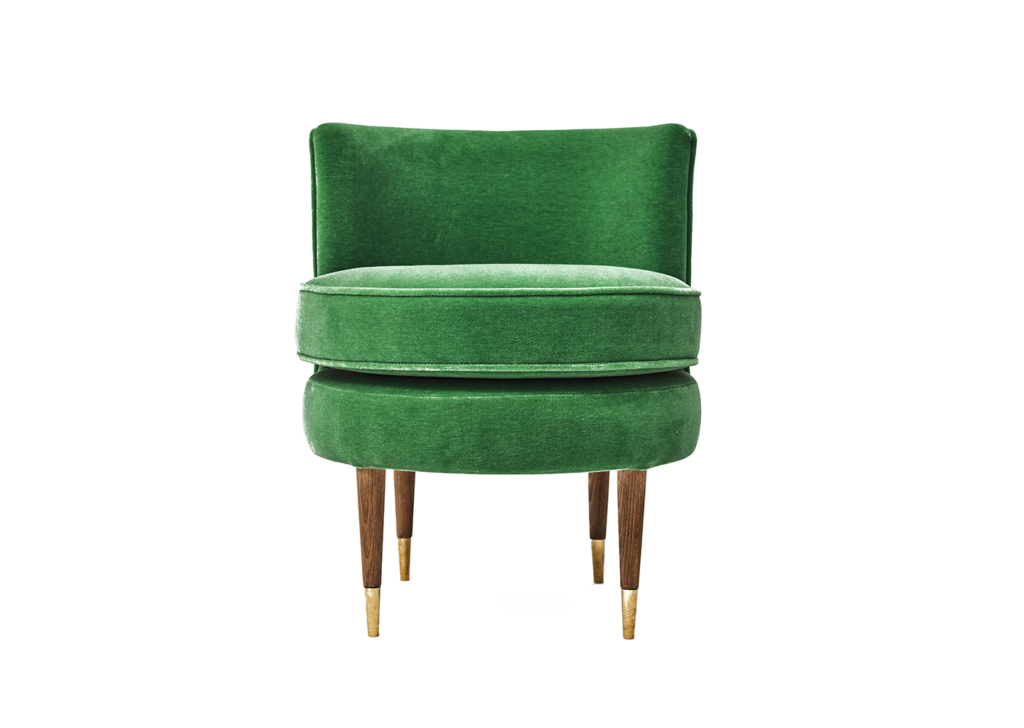 Cómoda butaca redonda en color verde inspirada en el lujo excéntrico de los maravillosos años 20. Rematada con patas en madera y detalles en latón dorado.