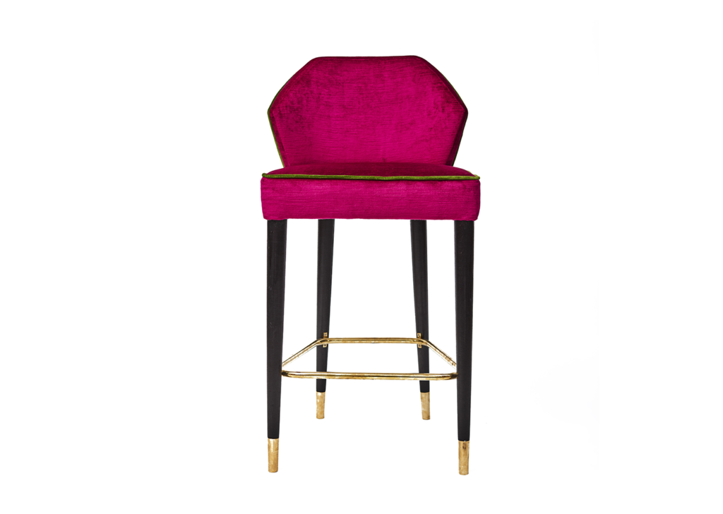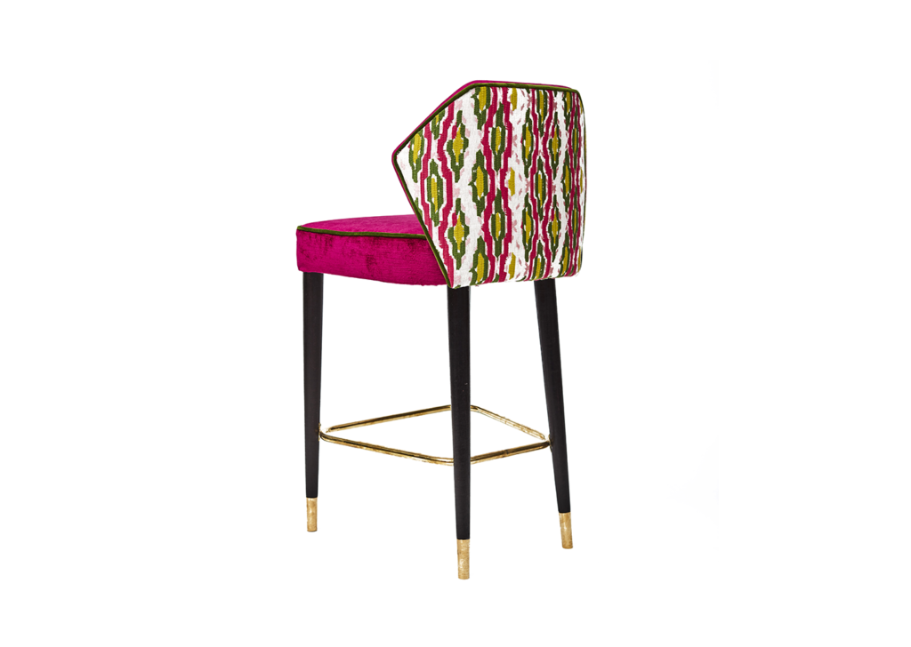 Banqueta tapizada en terciopelo rosa. Llama la atención el tapizado de su respaldo con formas geométricas en amarillo, verde y rosa. Las patas en negro y dorado rematan esta original y sorprendente pieza que no pasará desapercibida en ningún espacio.