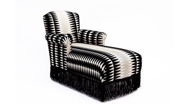 Chaise longue con estampado de rombos y círculos en blanco y negro. Llama la atención el acabado desflecado de Catherine.