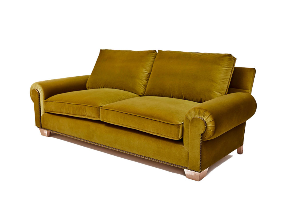 Sofá dos plazas con patas de latón, acolchado y amplios reposabrazos. ¿La característica más especial? Su tapizado en terciopelo color oliva y remachado dorado que dan ese toque vintage a tu interiorismo.